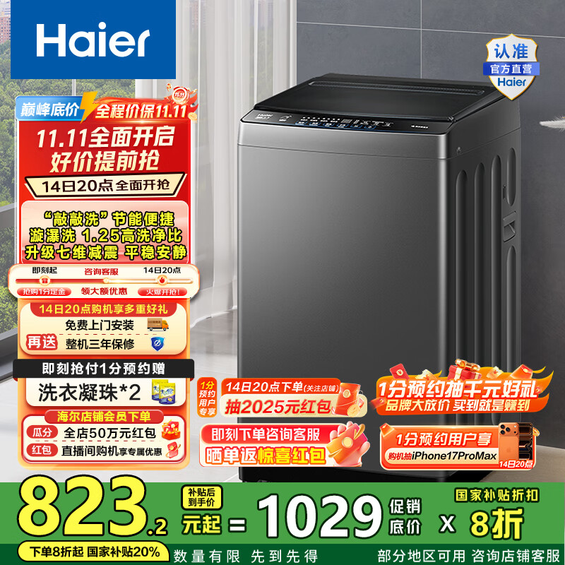 海尔(Haier)洗衣机波轮全自动10公斤大容量小型 直驱变频敲敲洗 漩瀑洗1.25洗净比 BZ20T0一级能效国家补贴20%