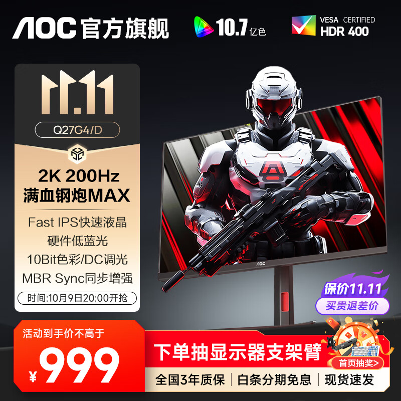 AOC Q27G4/D 27英寸显示器2K 200HZ电竞FastIPS快速液晶1ms满血小金刚高刷游戏电脑显示屏 【新】2K原生200Hz Q27G4/D