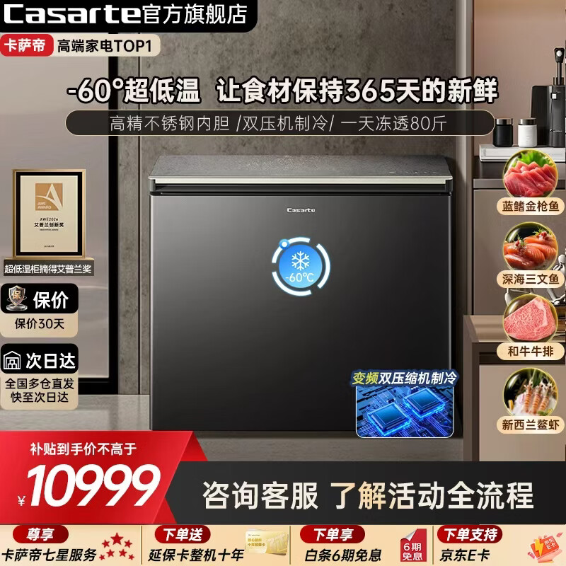 卡萨帝(Casarte)【专业锁鲜金枪鱼帝王蟹冰柜】 -60℃超低温细胞休眠技术156升超静音家用商用冷柜 一级能效超低温 -60°超低温丨深海珍馐食材专用冷冻柜 156升