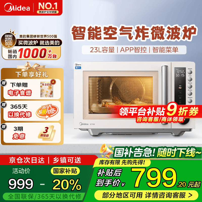 美的微波炉烤箱一体机F5 家用变频微烤炸三合一 23升容量/脱脂空气炸/智能菜单/APP操控 PC23F5W