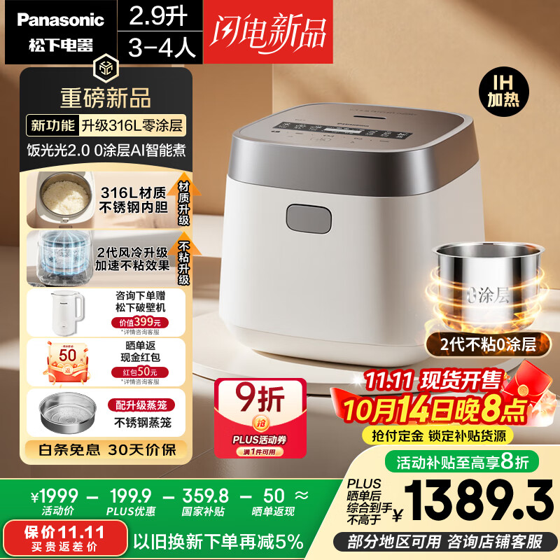 松下(Panasonic)【国家补贴20%】饭光光2.0电饭煲0涂层IH家用电饭锅3-4人无涂层不锈钢一级能效2.9升SR-HNS102-W