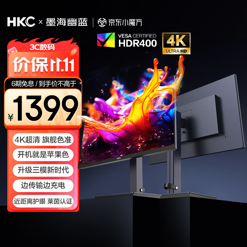 HKC 27英寸4K显示器超清75Hz双模144Hz IPS屏10bit HiDPI技术HDR400 Type-C90W办公mac笔电外接T2755U