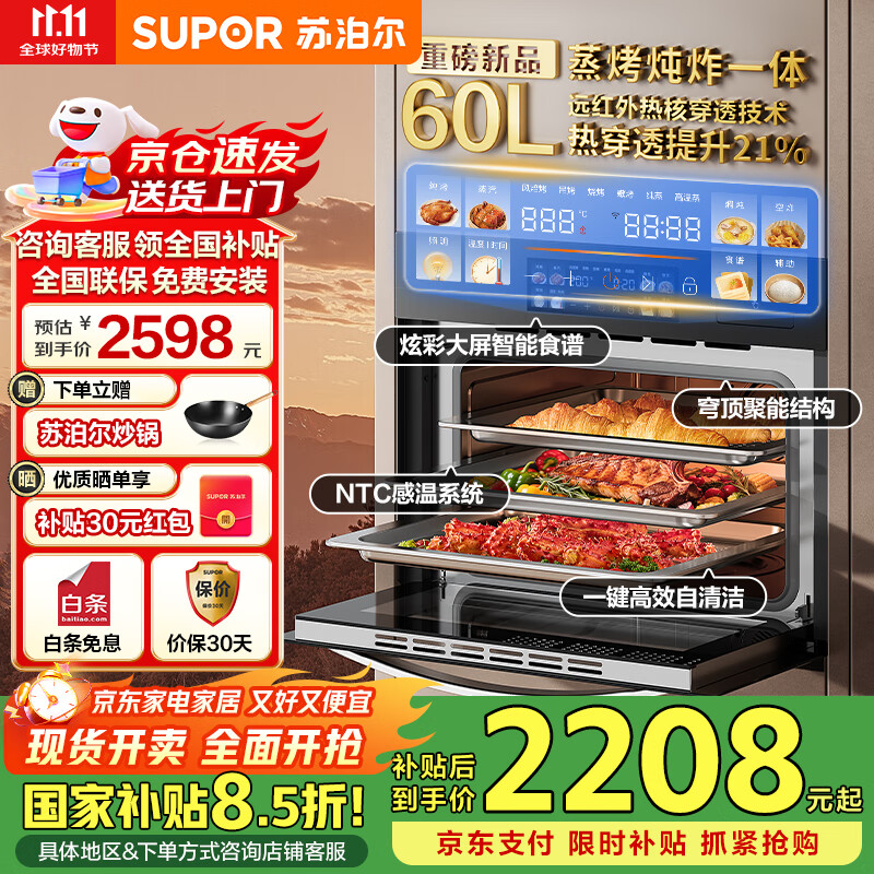 苏泊尔蒸烤箱嵌入式家用一体机台式厨卫换新国家补贴有惊喜60L大容量彩屏远红外蒸烤炸炖组合套装 DY50