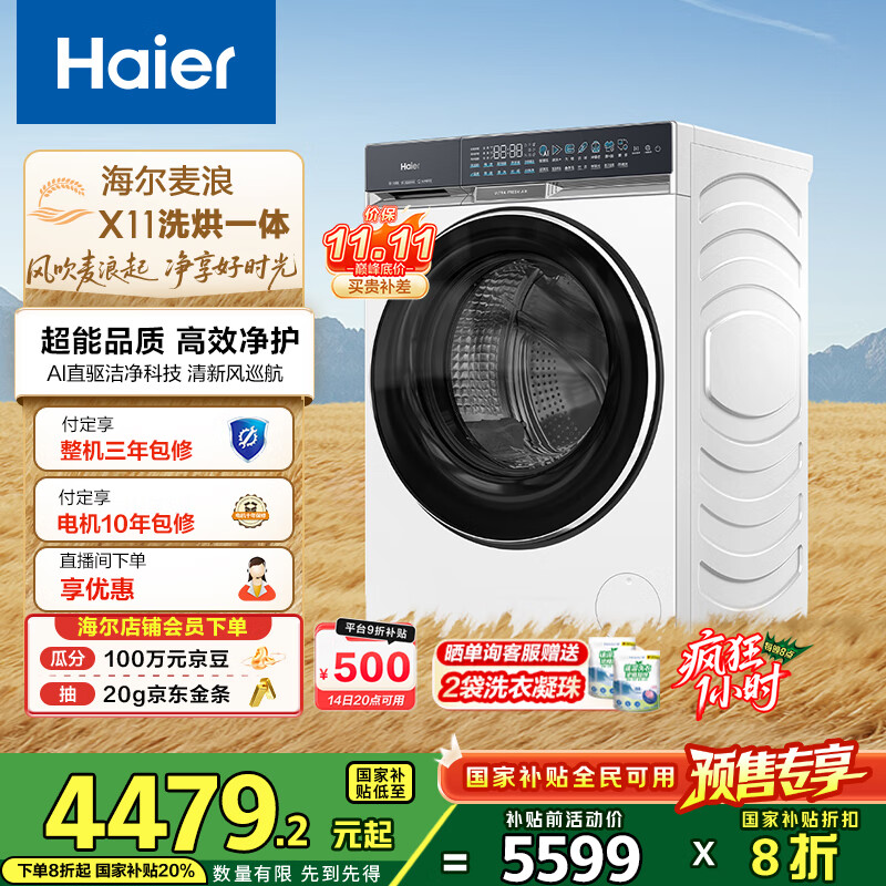 海尔(Haier)【麦浪套系】滚筒洗衣机全自动10公斤 超薄家用家电国家补贴 以旧换新一级能效 京东自营G87WU1