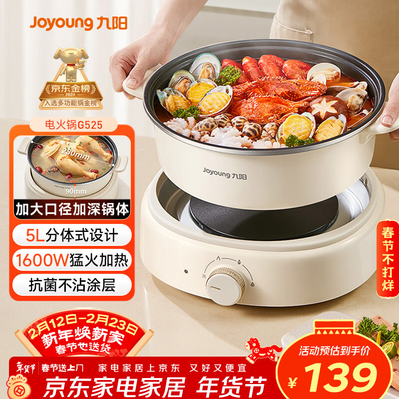 九阳(Joyoung)电火锅分体式可拆洗家用5L大容量火锅专用锅电煮锅电炒锅多功能不粘锅【单锅款】G525