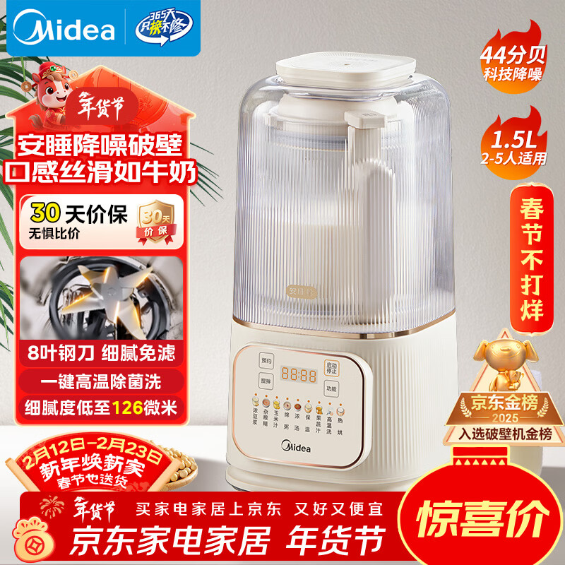 美的(Midea)安睡破壁机家用 1.5L智能降噪全自动免煮豆浆机 轻音44分贝 多功能五谷杂粮榨汁辅食料理机年货555
