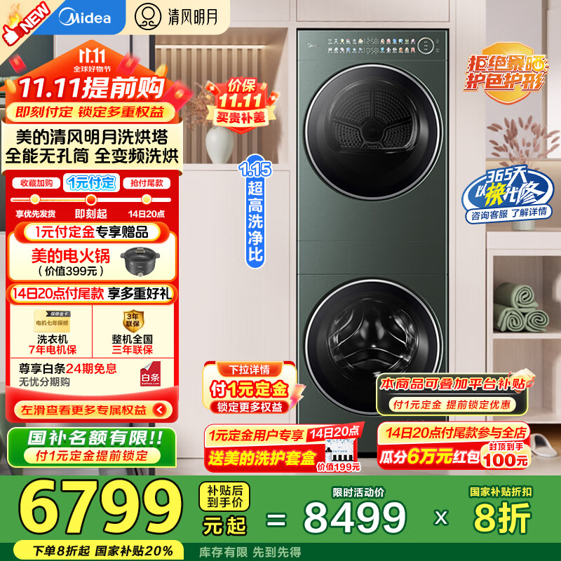 美的(Midea)洗烘套装 10KG全自动滚筒洗衣机+热泵烘干机 全变频【清风明月2.0洗烘塔】远山青 以旧换新 国补补贴20% 远山青MGH20MAX-G