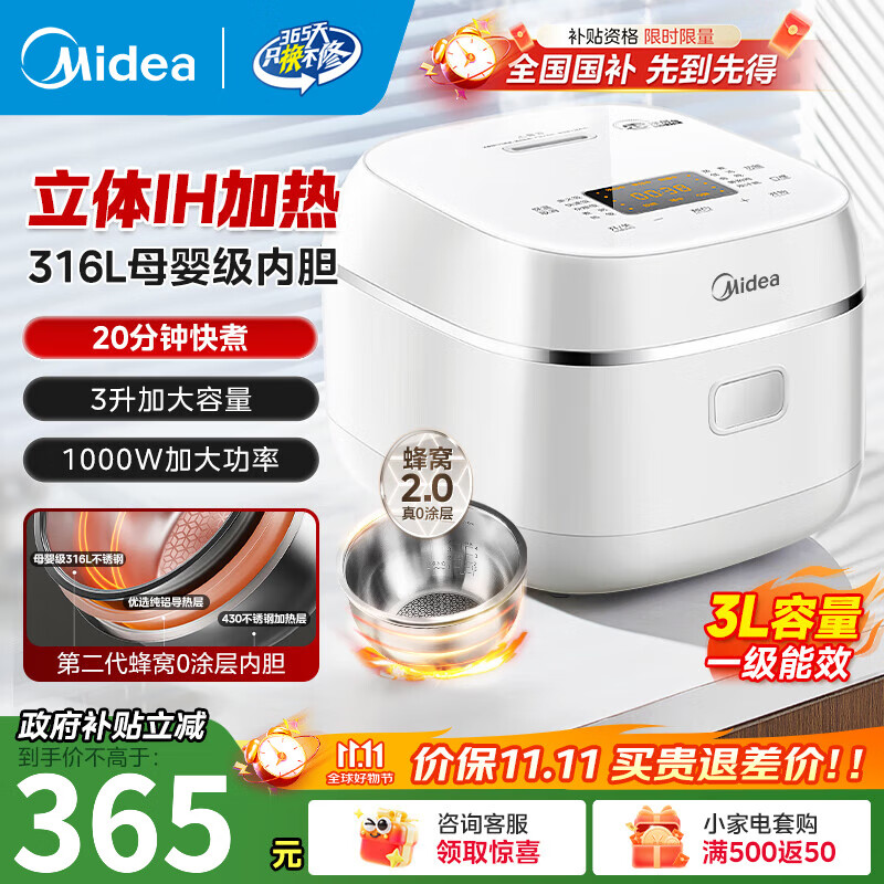 美的(Midea)电饭煲微压IH加热电饭锅0涂层2-4-5-8人无涂层316L不锈钢内胆母婴级可煮小米粥智能预约一级能效 316L母婴级内胆 3L 无涂层不粘锅