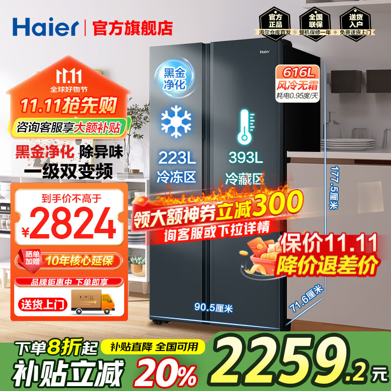 海尔(Haier)冰箱双开门616升对开门一级变频家用大容量对开门二门超薄电冰箱国家补贴20%家电以旧换新 BCD-616WGHSSEDC9