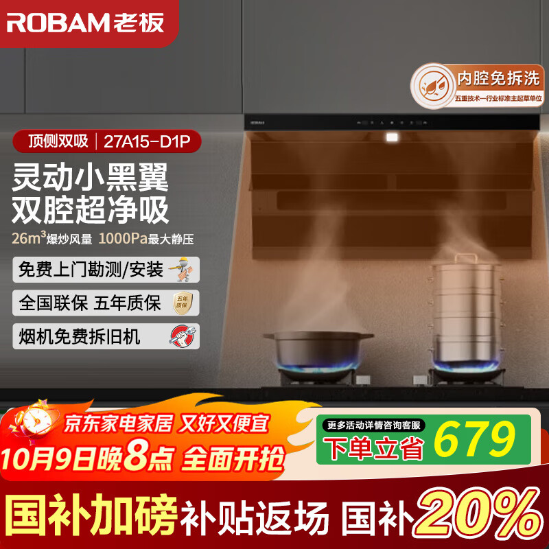 老板【小黑翼D1P】真平嵌顶侧双吸吸油烟机26风量超薄抽油烟机家用大吸力7字型油烟机国补27A15-D1P 【火山岩黑】27A15-D1P
