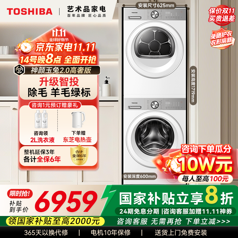 东芝【官方旗舰店】玉兔2.0高奢版 T183BW 纯平全嵌洗烘套装 10KG全自动滚筒洗衣机+变频热泵式烘干机 DG-10T183BW+DH-10T183BW