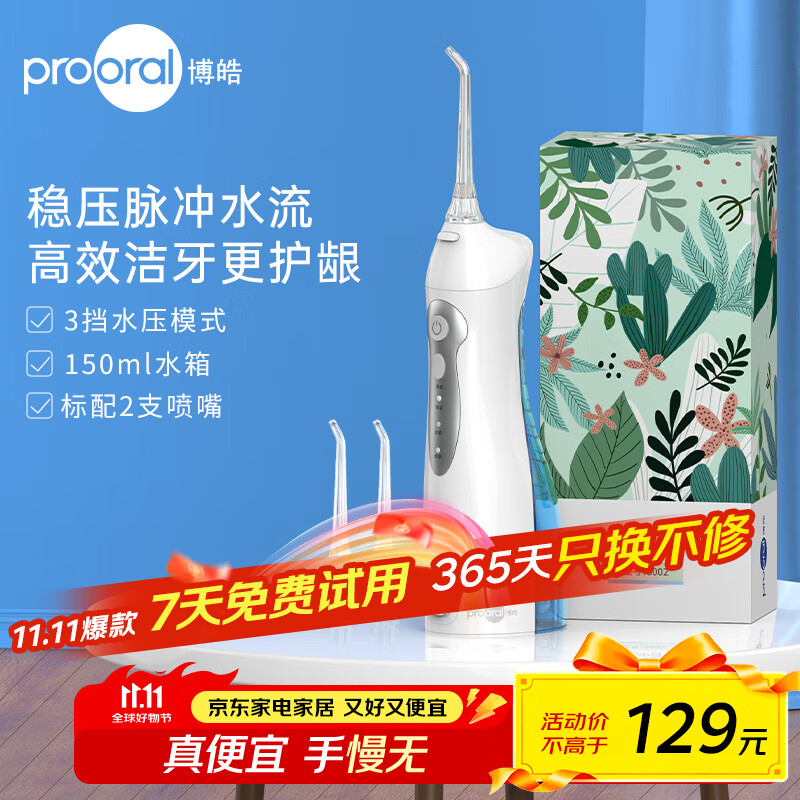 博皓(prooral)电动冲牙器便携式洗牙器牙齿冲洗器水牙线洁牙器牙缝清洁器剔牙神器牙垢去除工具正畸呵护手持立式 琉璃蓝| 3种模式| 经典脉冲