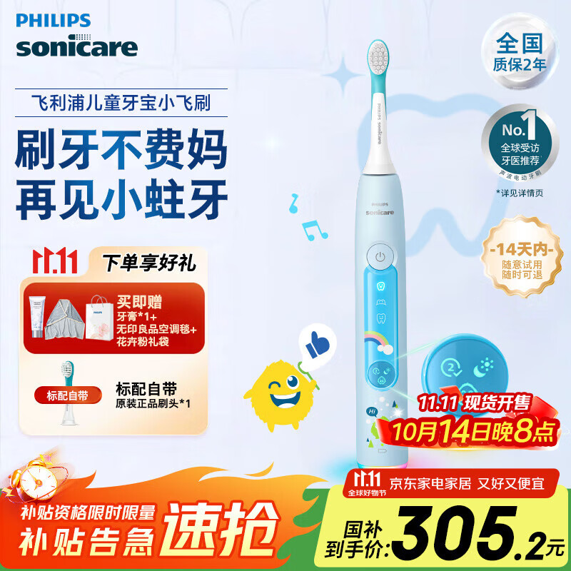 飞利浦电动牙刷儿童电动牙刷牙宝小飞刷声波电动牙刷宝宝软毛刷儿童定制生日礼物官方旗舰店礼物 星光蓝HX5232/01-全新儿童小飞刷
