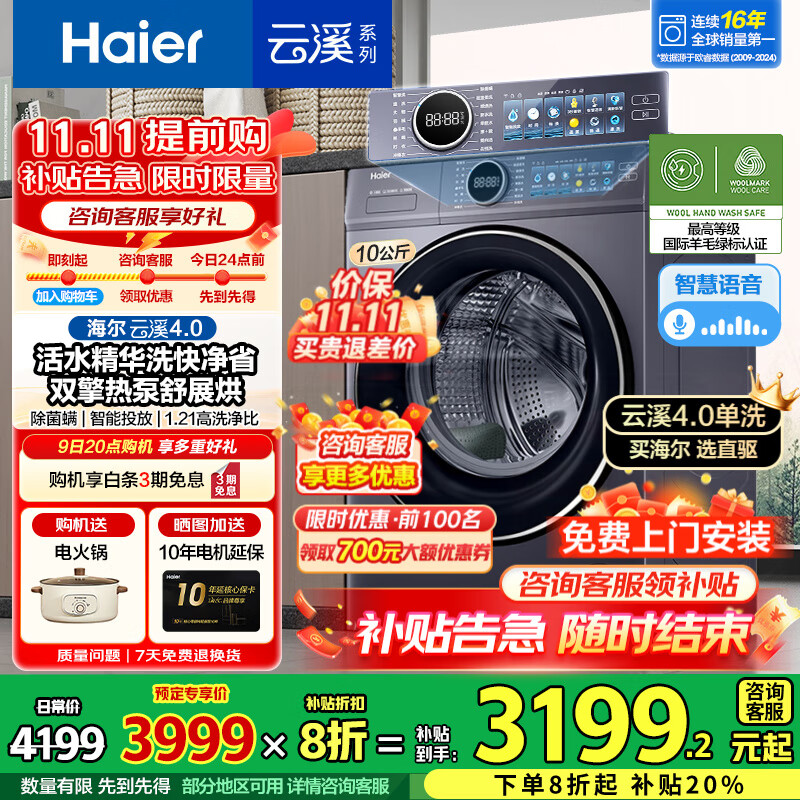 海尔(Haier)【云溪4.0】77E滚筒洗衣机全自动直驱精华洗2.0超薄平嵌羊毛绿标认证一级能效家电国家补贴 77E单洗|直驱精华洗2.0+1.21超高洗净比