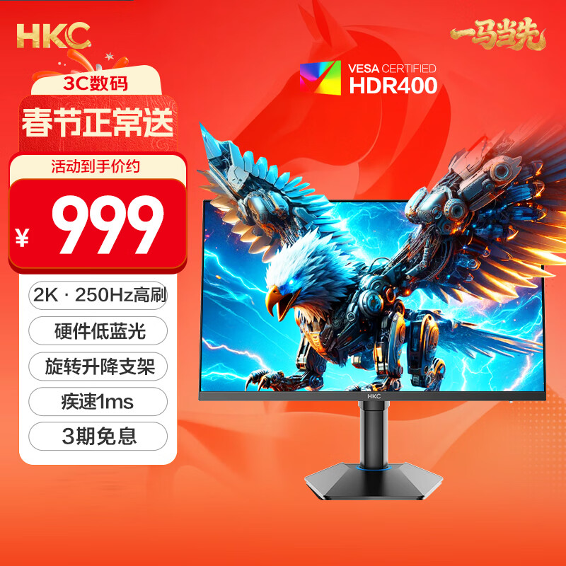HKC 24.5英寸2K 240Hz高刷250Hz FastIPS硬件低蓝光HDR400旋转升降1Ms游戏电竞电脑显示器 猎鹰G25H4