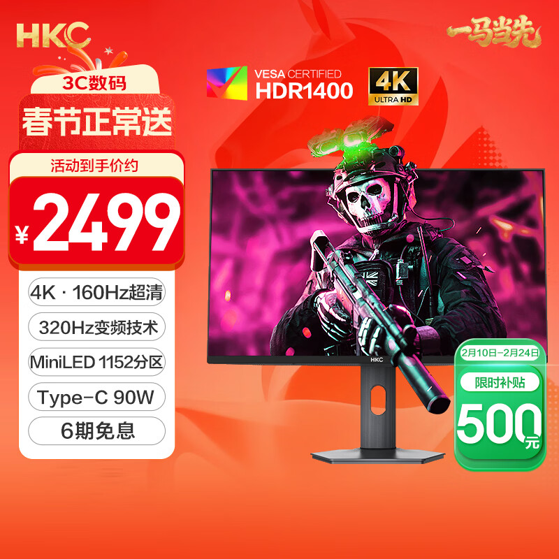 HKC 27英寸4K 160Hz双模320Hz QD量子点MiniLED广色域HDR1400认证Type-C90W电竞游戏显示器G27M7Pro