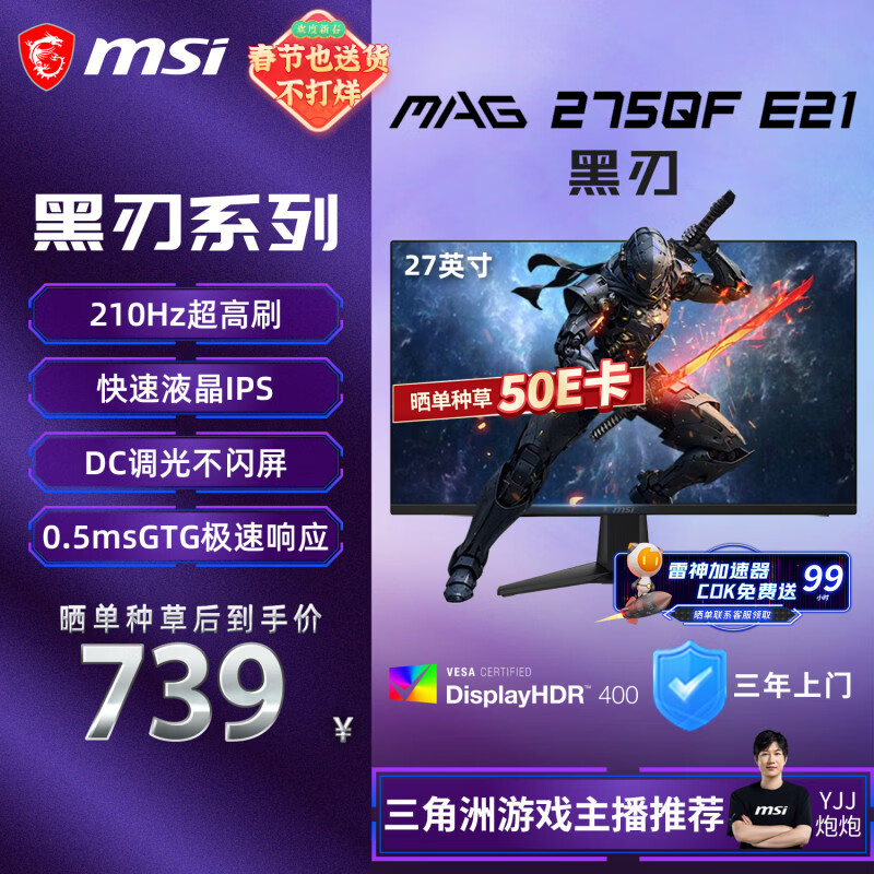 微星(MSI)黑刃E21 MAG 275QF E21 27英寸2K200hz HDR400 超频210hz三角洲游戏电竞小金刚电脑显示器显示屏