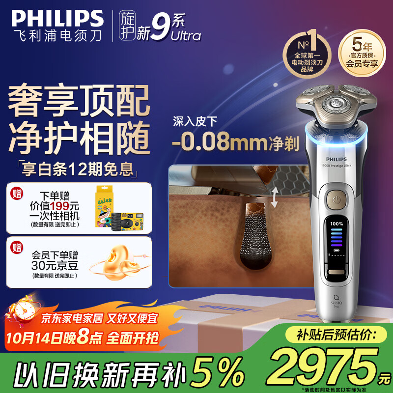 飞利浦(PHILIPS)电动剃须刀 全新一代旋护式新9系ultra-24H持久净剃刮胡刀配升级清洁仓 生日礼物送父亲 国家补贴