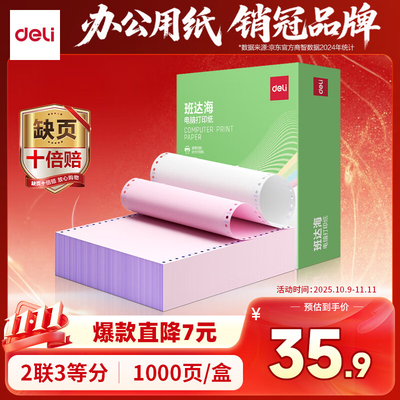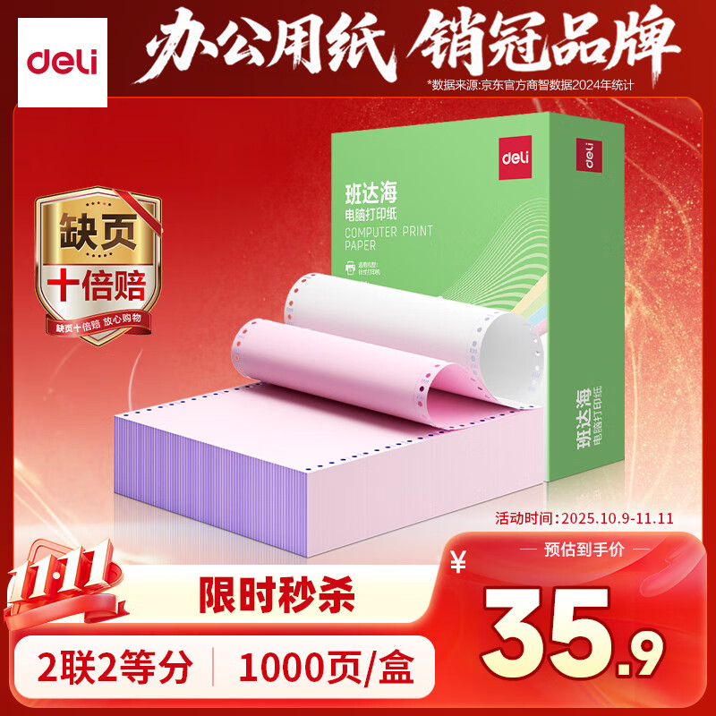 得力(deli)【缺页十倍赔】班达海二联三等分针式打印纸 可撕边电脑打印纸 彩色(白红)出库送货单1000页/箱