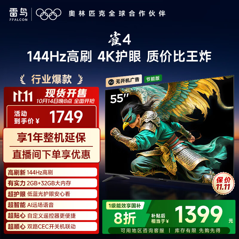 TCL雷鸟电视 55雀4 55英寸 144Hz高刷 2+32GB 护眼模式 自定义遥控器 家电国家补贴电视55F270C-JN