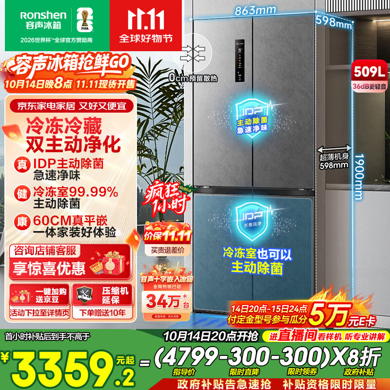 容声509升双净十字对开四开门超薄零嵌入式冰箱家用一级能效无霜BCD-509WD2FPQLA灰国家补贴517十字款