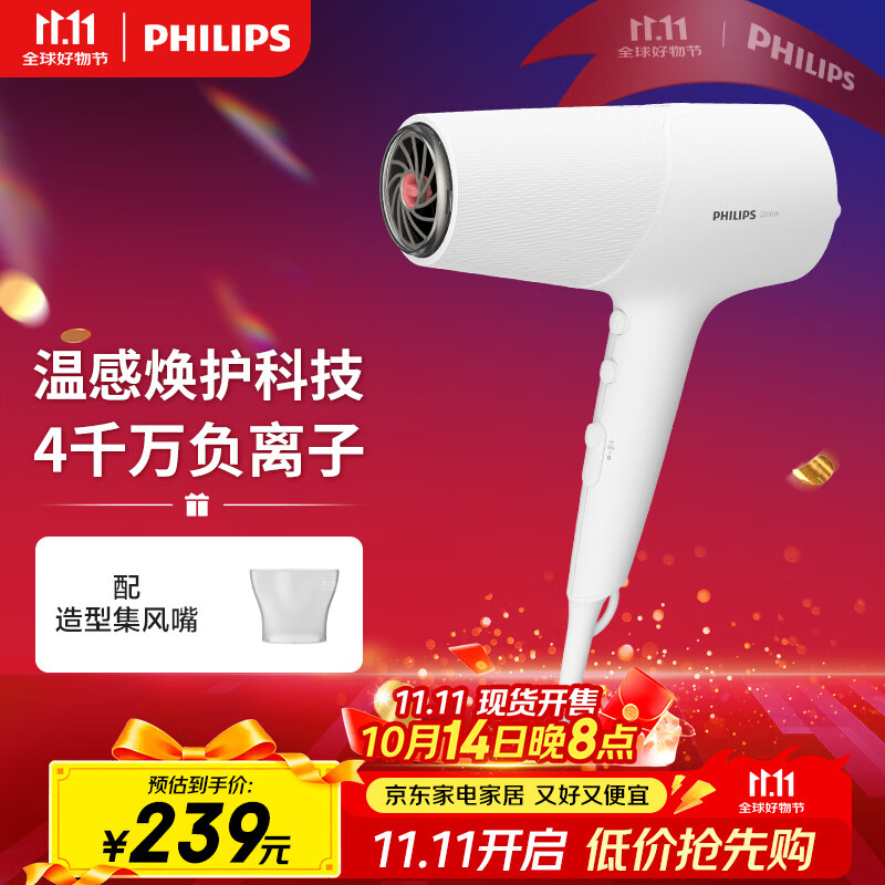 飞利浦(PHILIPS)电吹风机负离子 5系蓬蓬筒 温感焕护4千万负离子 大功率速干 白色 生日礼物
