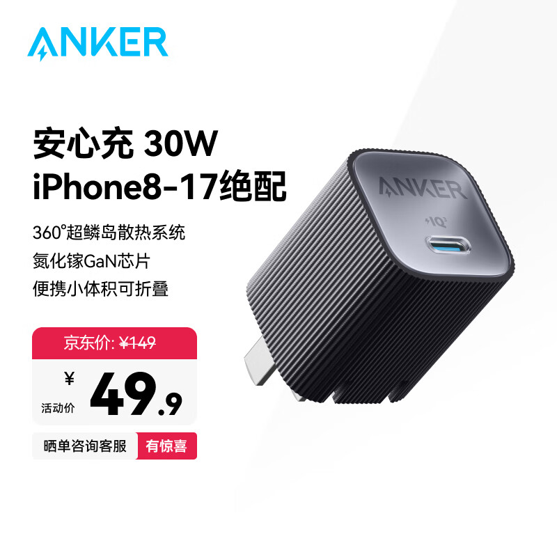ANKER安克30W安心充17/16 type-c充电器氮化镓PD快充适用苹果17iPhone15promaxApple手机iPad插头 黑