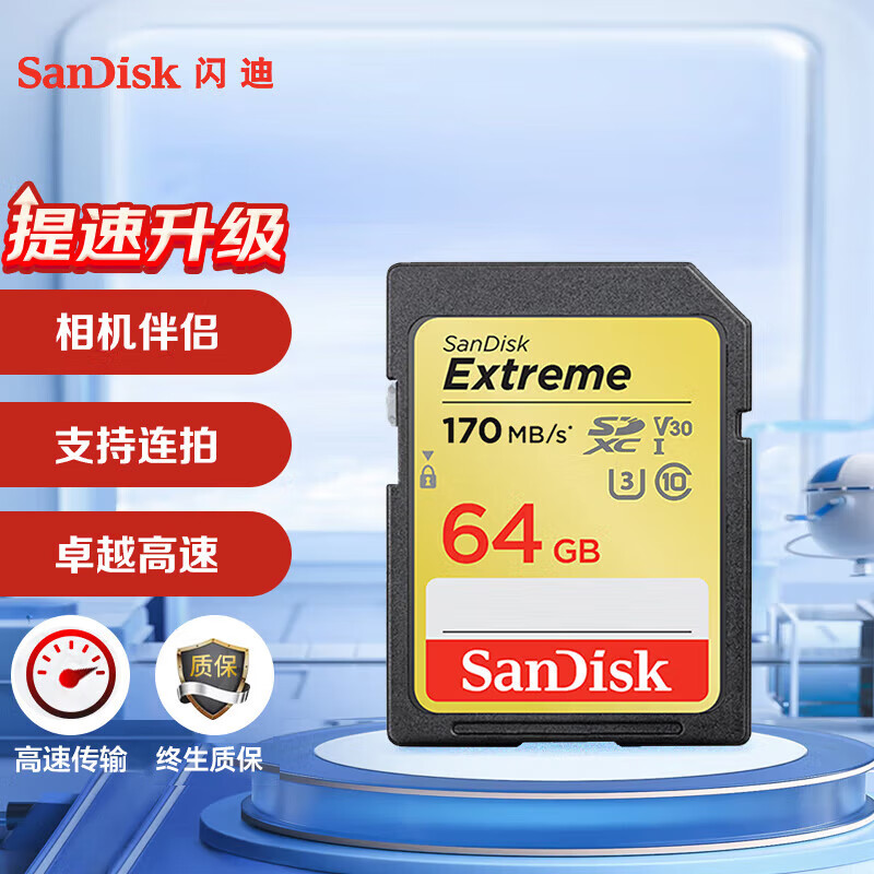 闪迪(SanDisk)64GB SD内存卡 4K V30 U3 C10 相机存储卡 读速170MB/s 写速80MB/s 高速连拍 微单/单反相机