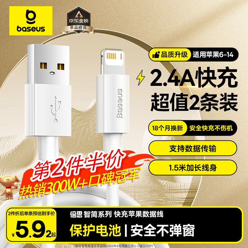 倍思苹果数据线快充充电线适用iPhone14/13/12Pro Max/XR/Xs/11/8手机ipadpro/air2平板车载1.5米2条装
