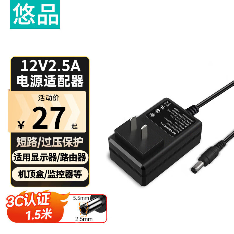 悠品12V2.5A/3A电源适配器电脑显示器电源线路由器机顶盒监控摄像头DC充电器5.5*2.5/2.1mm圆口通用2A