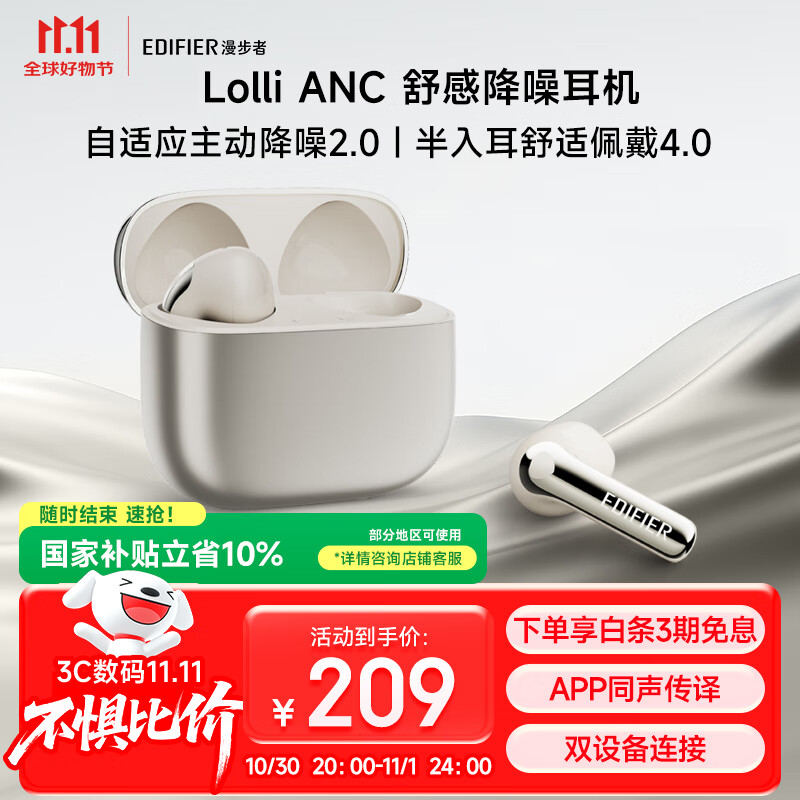 漫步者(EDIFIER)萝莉豆Lolli ANC 半入耳主动降噪蓝牙耳机 同声传译 适用苹果华为小米OPPO手机 星光金
