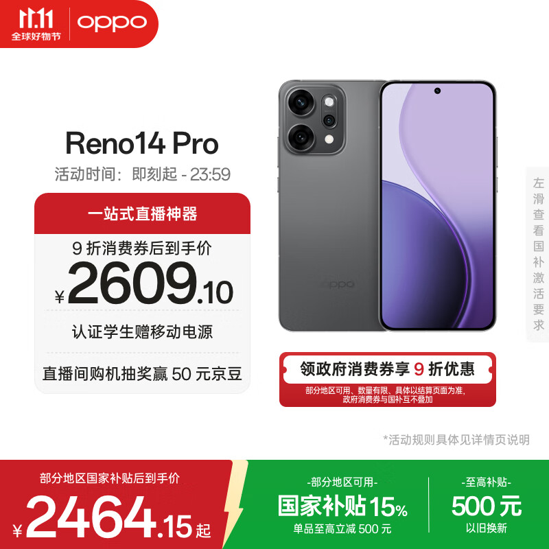 OPPO Reno14 Pro 12GB+256GB 礁石黑 直播神器 全新小直屏无线充电 AI拍照5G智能手机学生游戏国家补贴