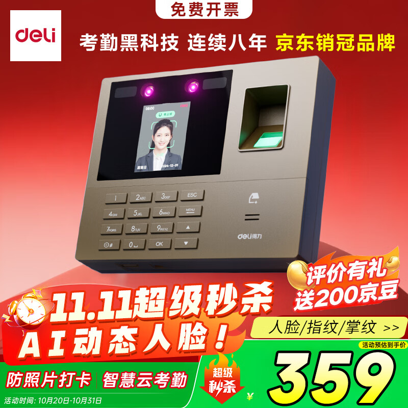 得力智能云考勤机 打卡机 掌静脉+人脸+指纹 动态人脸识别 wifil联网 远程在线管理33800CSPRO