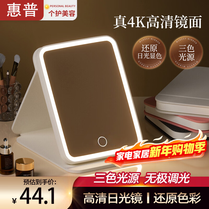 惠普化妆镜带灯led旅行便携镜子宿舍随身学生皮质折叠梳妆镜 白色