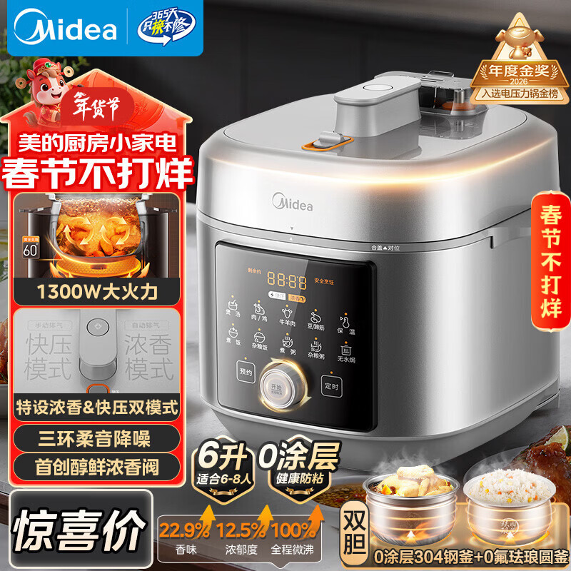 美的(Midea)【送礼好年货】沸腾浓香小飞侠电压力锅0氟0涂层双胆高压锅6L大容量家用煲汤6-10人煮饭煲E6825N