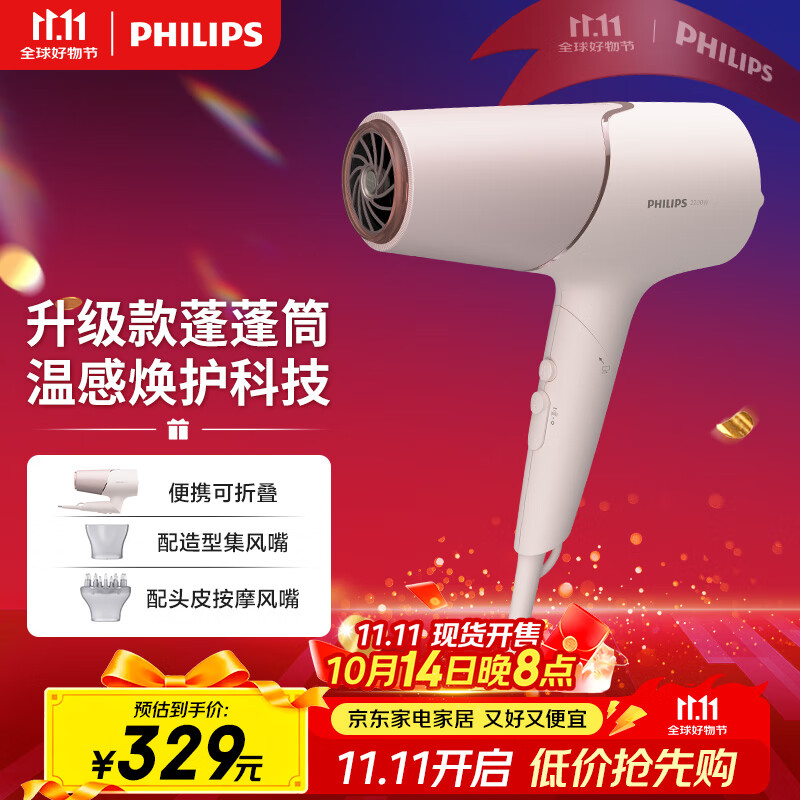 飞利浦(PHILIPS)电吹风机负离子5系Pro 蓬蓬筒 温感焕护4千万负离子 大功率大风速干 柔漾粉 生日礼物