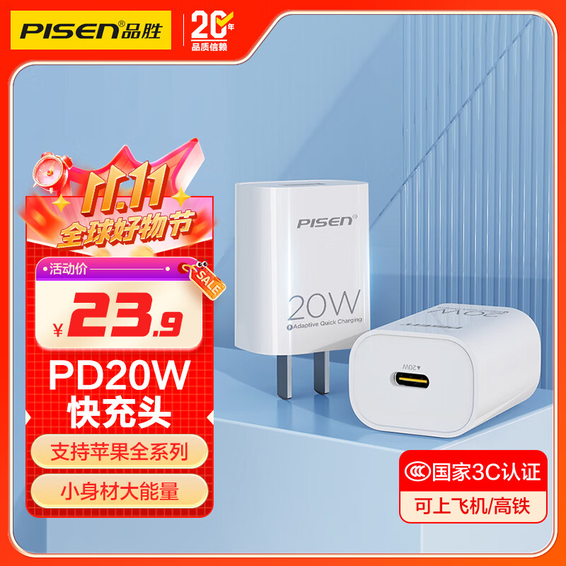 品胜3C认证苹果充电器PD20W快充iPhone17Air充电头type-c插头通用苹果16/15/14小米华为三星手机ipad