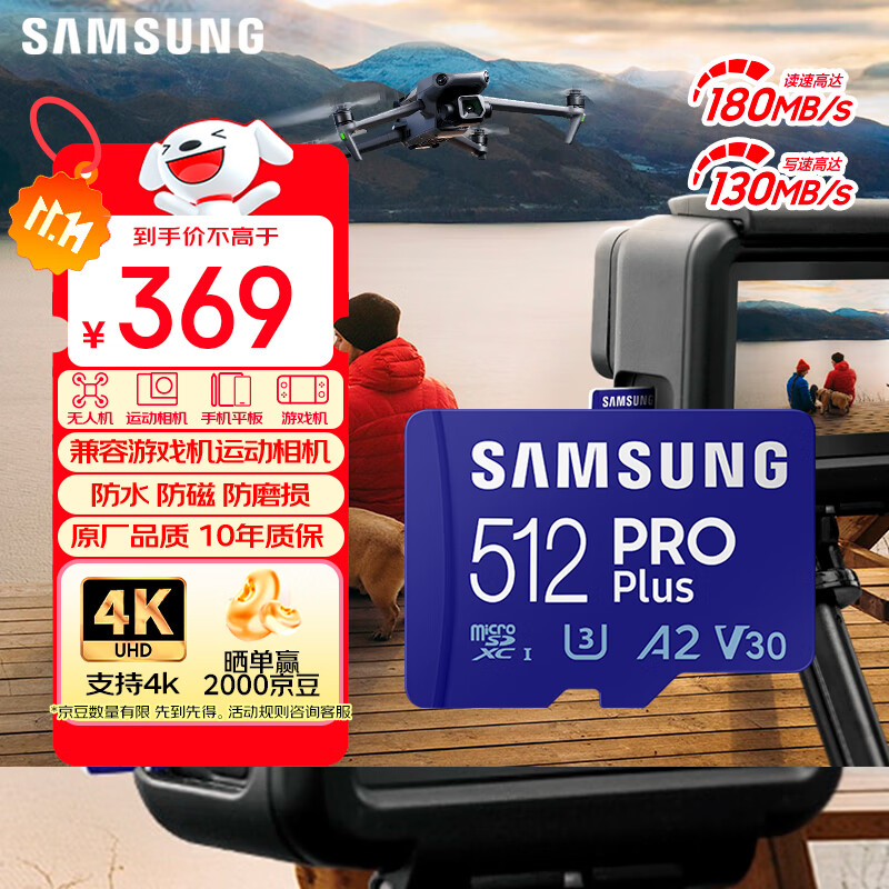 三星(SAMSUNG)512GB TF MicroSD 内存卡 4K高速蓝卡 U3A2V30 读速180MB/s 游戏机无人机运动相机存储卡 PRO Plus