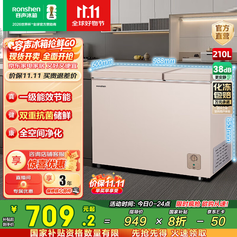 容声[国家补贴20%]210升冰柜家用商用冷藏冷冻两用双温大冷柜卧式冰箱一级能效大容量断电保护以旧换新 钛空金 210L BCD-210MSA