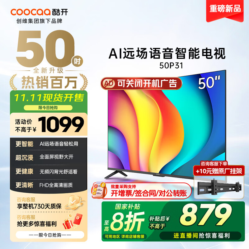 酷开(coocaa)创维电视 50P31 50英寸 节能款 护眼 高清智慧屏全面屏 投屏电视排名前十名 平板电视机 以旧换新 50英寸 电视