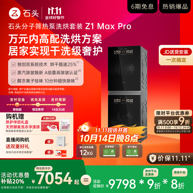 石头分子筛热泵洗烘套装Z1 Max Pro 国家补贴 12kg滚筒洗衣机+变频烘干机【XQG120RRC32+RRG32】黑曜石