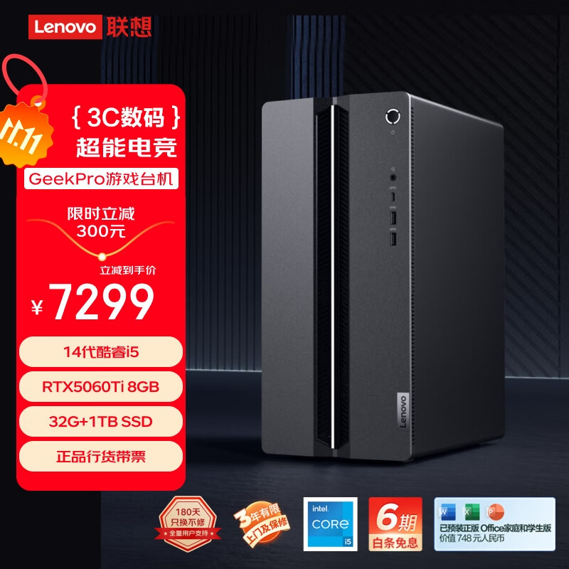 联想(Lenovo)GeekPro设计师游戏台式电脑主机(酷睿i5-14400F RTX5060Ti 8GB显卡 32G DDR5 1TB SSD )国家补贴