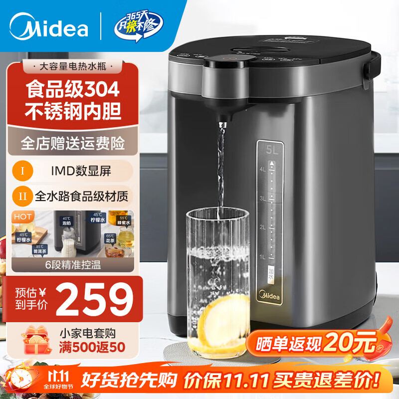 美的(Midea)电热水瓶 5L升大容量保温除氯电水瓶 家用烧水壶保温一体全自动恒温电热水壶开水壶 5L 【304食品级内胆】MK-SP50C505B
