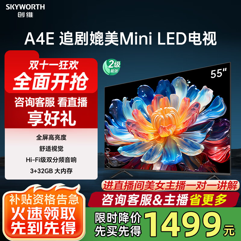 创维电视55A4E 55英寸 deepseek AI电视 120Hz高刷 远场语音 超薄全面屏 4K高清智慧液晶平板电视机 55英寸 电视二级能效 以旧换新 追剧媲美Mini LED