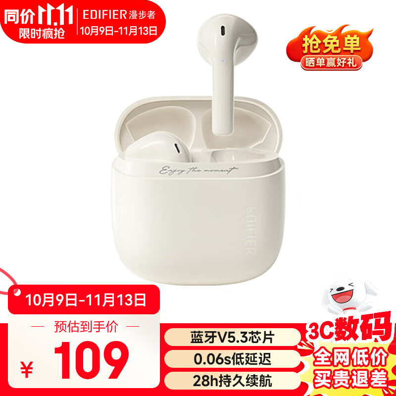 漫步者(EDIFIER)【今/次日达】花再Zero Air真无线蓝牙耳机半入耳式蓝牙5.3通话降噪游戏耳麦适用苹果Pro安卓手机 月白+入会享5元