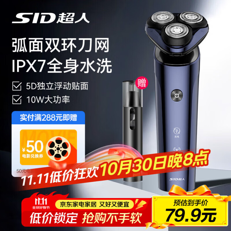 超人【出行必备】电动剃须刀智能旋转式三刀头大功率刮胡刀全身水洗生日礼物送男友送老公RS7371