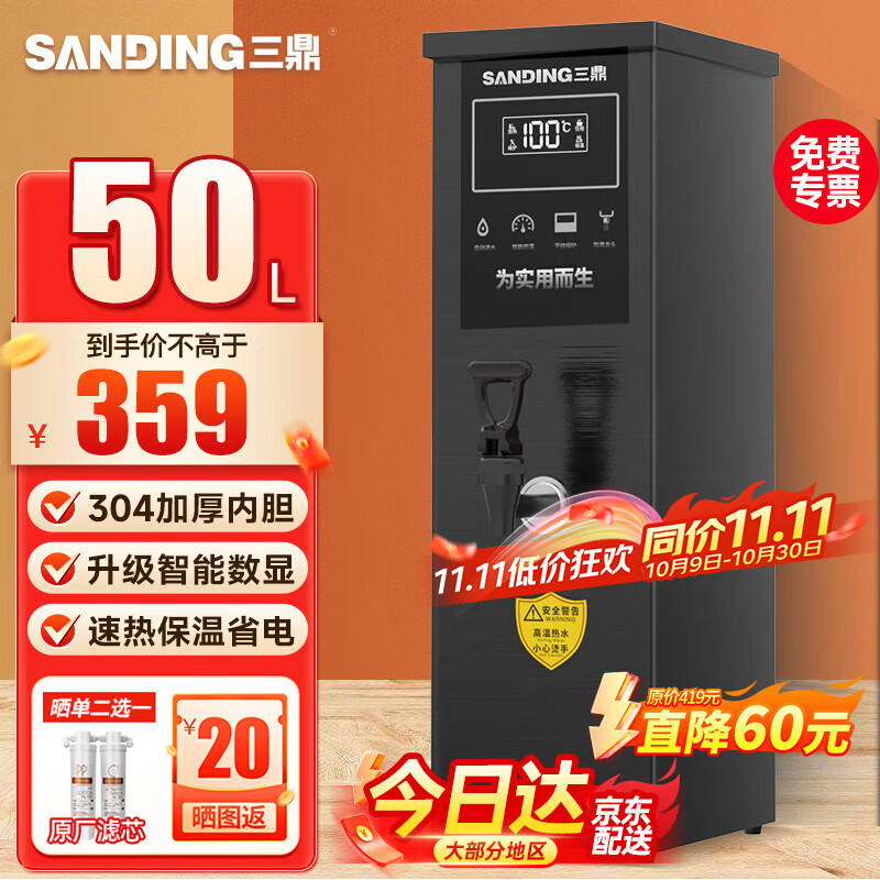 三鼎 开水器商用开水机奶茶店全自动吧台机 步进式电热烧水器热水机饮水机开水桶 BT-10A黑色