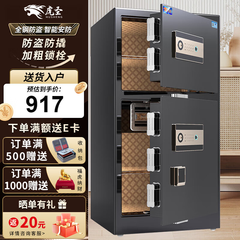 虎圣保险柜家用办公小型指纹密码保险箱全钢防盗可入墙财务专用保密保管柜80cm双门商务黑
