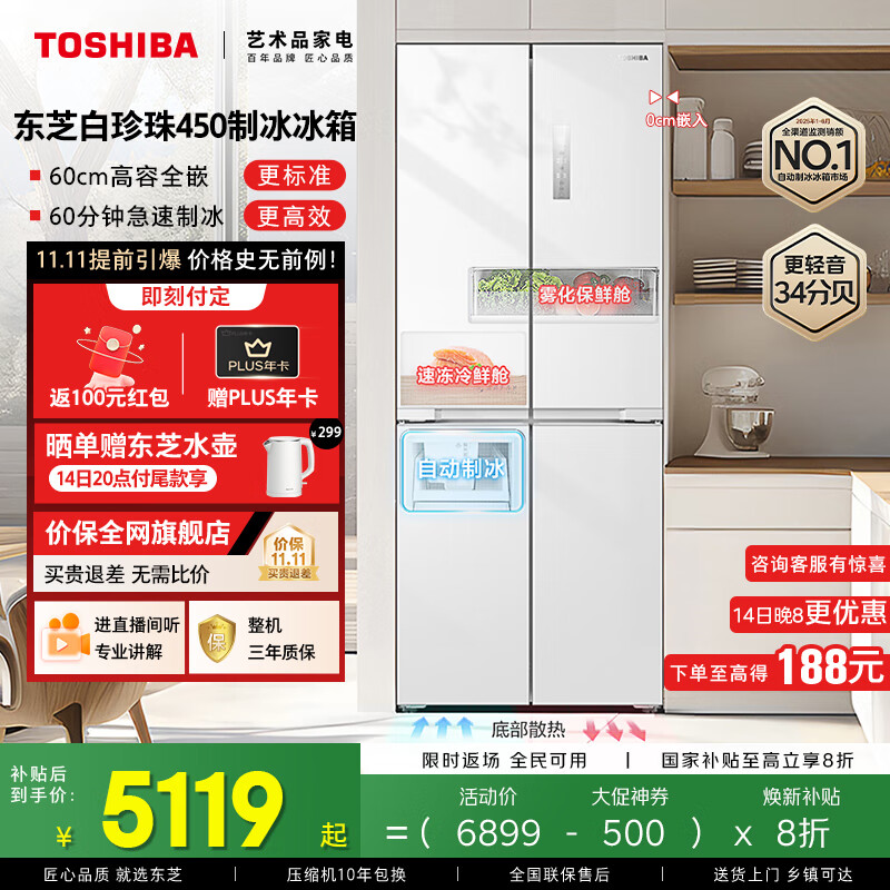 东芝(TOSHIBA)白珍珠450自动制冰60cm超薄零嵌平嵌入式国家补贴十字对开门家用一级能效电冰箱GR-RF450WI-PM151