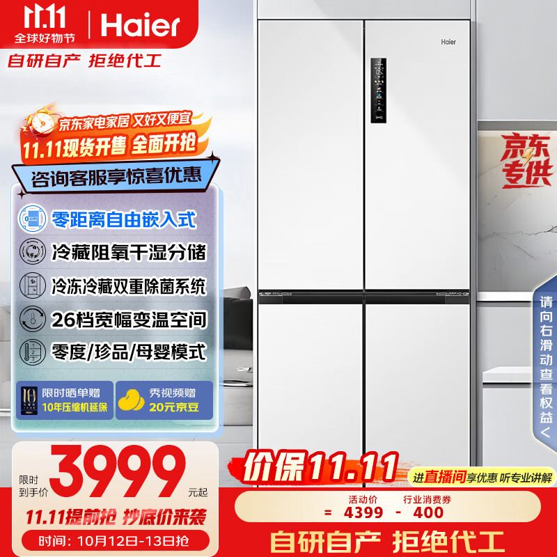 海尔(Haier)家宴500L零距离自由嵌入式十字对开四门电冰箱家用保鲜一级能效BCD-500WGHTD49W9U1国家补贴20%